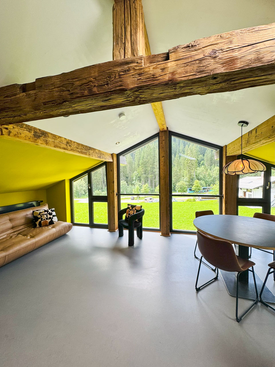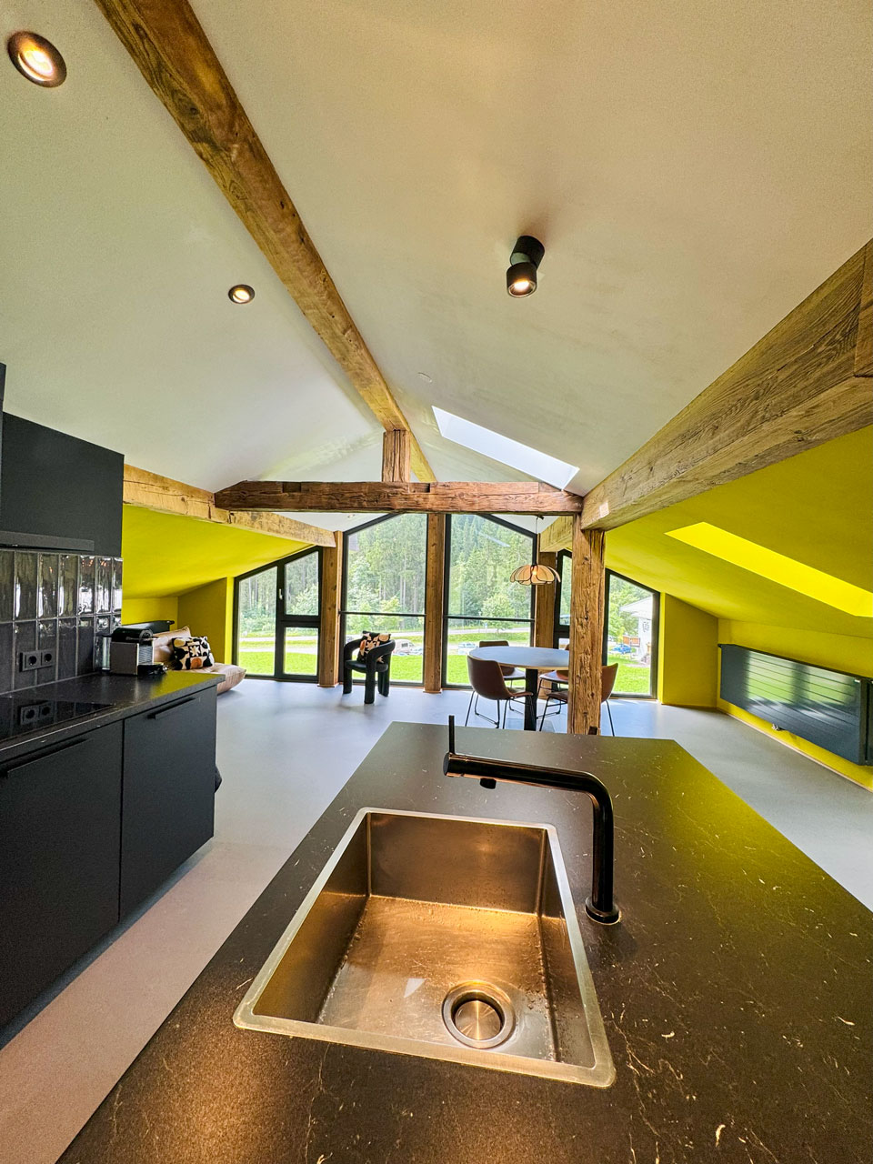 Das großzügige Apartment von 85 m2 ist geeignet für 4 – 5 Personen und verfügt über 2 Schlafzimmer, 1 Badezimmer, eine moderne Küche mit Kochinsel und ein großes Wohnzimmer. Die große offene Küche ist modern eingerichtet und mit allen Extras ausgestattet. Der gemütliche Essbereich lädt ein zum gemeinsamen Essen, Spielen oder Absacker nach einem aktiven Tag in der Natur. Der Sitzbereich bietet außerdem eine phänomenale Aussicht; durch das große Panoramafenster blicken Sie auf den höchsten Berg des Kleinwalsertals, den Großen Widderstein (2533m).